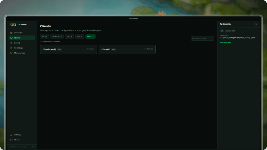No additional setup is required for supported clients. mTarsier detects them automatically after installation and makes their configurations available for management.